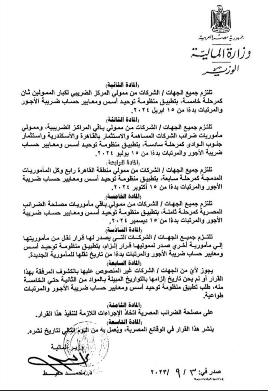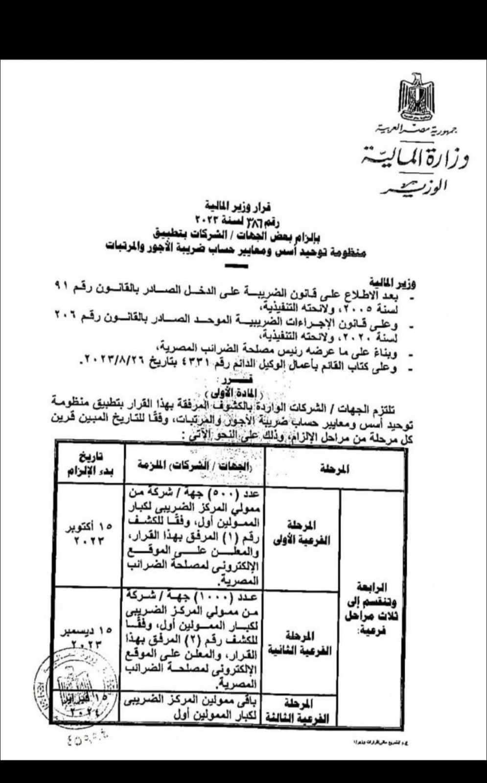 إلزام جميع الشركات التابعة لمأموريات الشركات المساهمة و الاستثمار بالقاهرة والإسكندرية وجنوب الوادى بتطبيق منظومة توحيد أسس ومعايير حساب ضريبة الأجور والمرتبات ابتداء من ١٥ يوليو ٢٠٢٤ وفقا لقرار وزير المالية رقم ٣٨٦ لسنة ٢٠٢٣