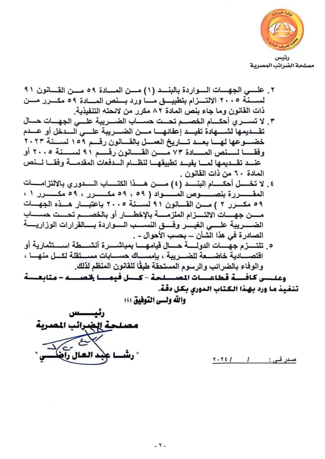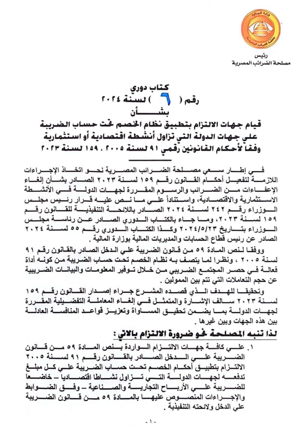 لغاء إعفاءات الضرائب والرسوم المقررة لجهات الدولة.. كتاب دوري رقم (6) لسنة 2024، صادر عن مصلحة الضرائب المصرية، بشأن قيام جهات الإلتزام بتطبيق نظام الخصم تحت حساب الضريبة على جهات الدولة التي تزاول أنشطة إقتصادية أو إستثمارية وفقاً لأحكام القانونين رقمي 91 لسنة 2005 و 159 لسنة 2023