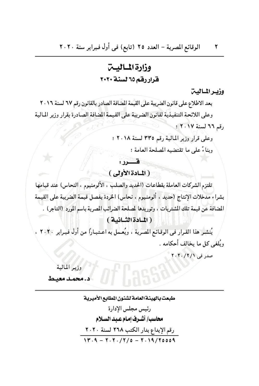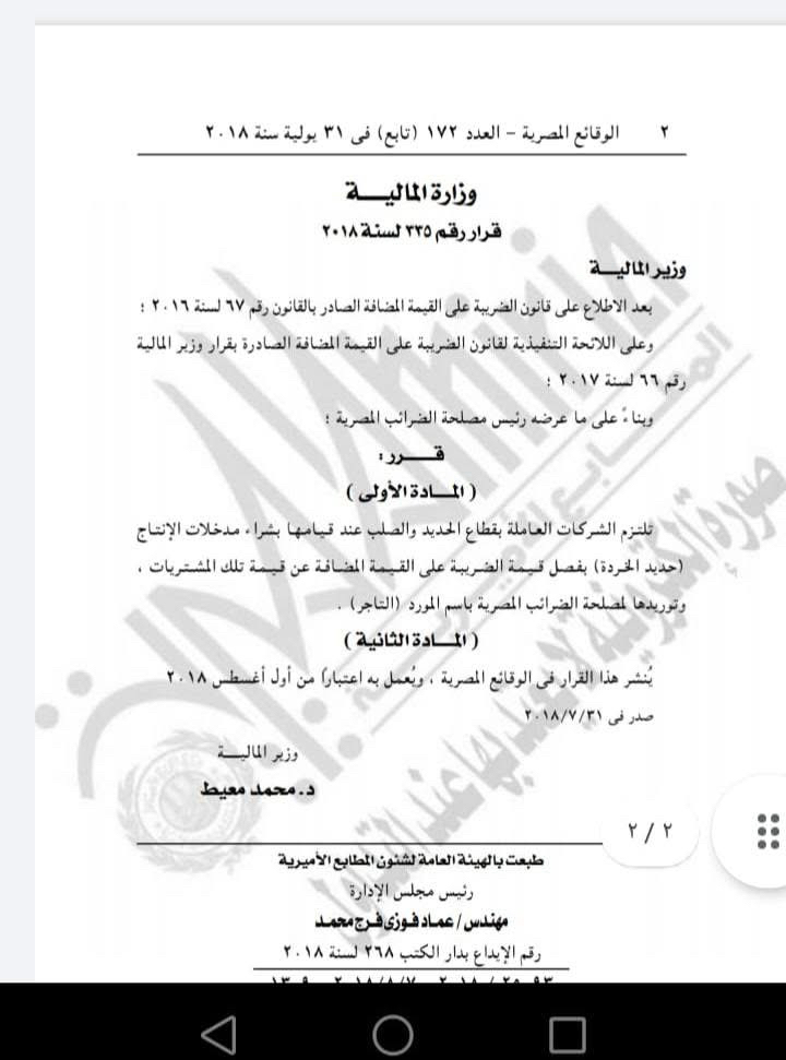 إلغاء قرار وزير المالية رقم 335 لسنة 2018 وكذلك إلغاء قرار وزير المالية رقم 65 لسنة 2020 وذلك بموجب قرار وزير المالية رقم 127 لسنة 2025 وذلك فيما يخص ضريبة القيمة المضافة عن الخردة المشتراة بمعرفة الشركات العاملة بقطاعات الحديد والصلب والألومنيوم والنحاس