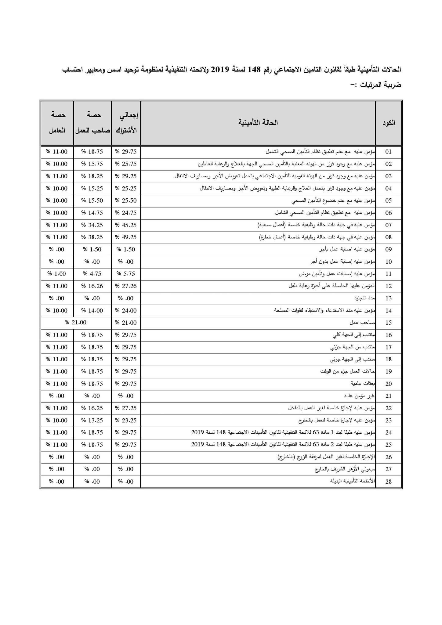 الحالات التأمينية طبقاً لقانون التامين الاجتماعي رقم 148 لسنة 2019 ولائحته التنفيذية لمنظومة توحيد أسس ومعايير احتساب ضريبة المرتبات نسب التأمينات الاجتماعية ( حصة صاحب العمل & حصة العامل ).