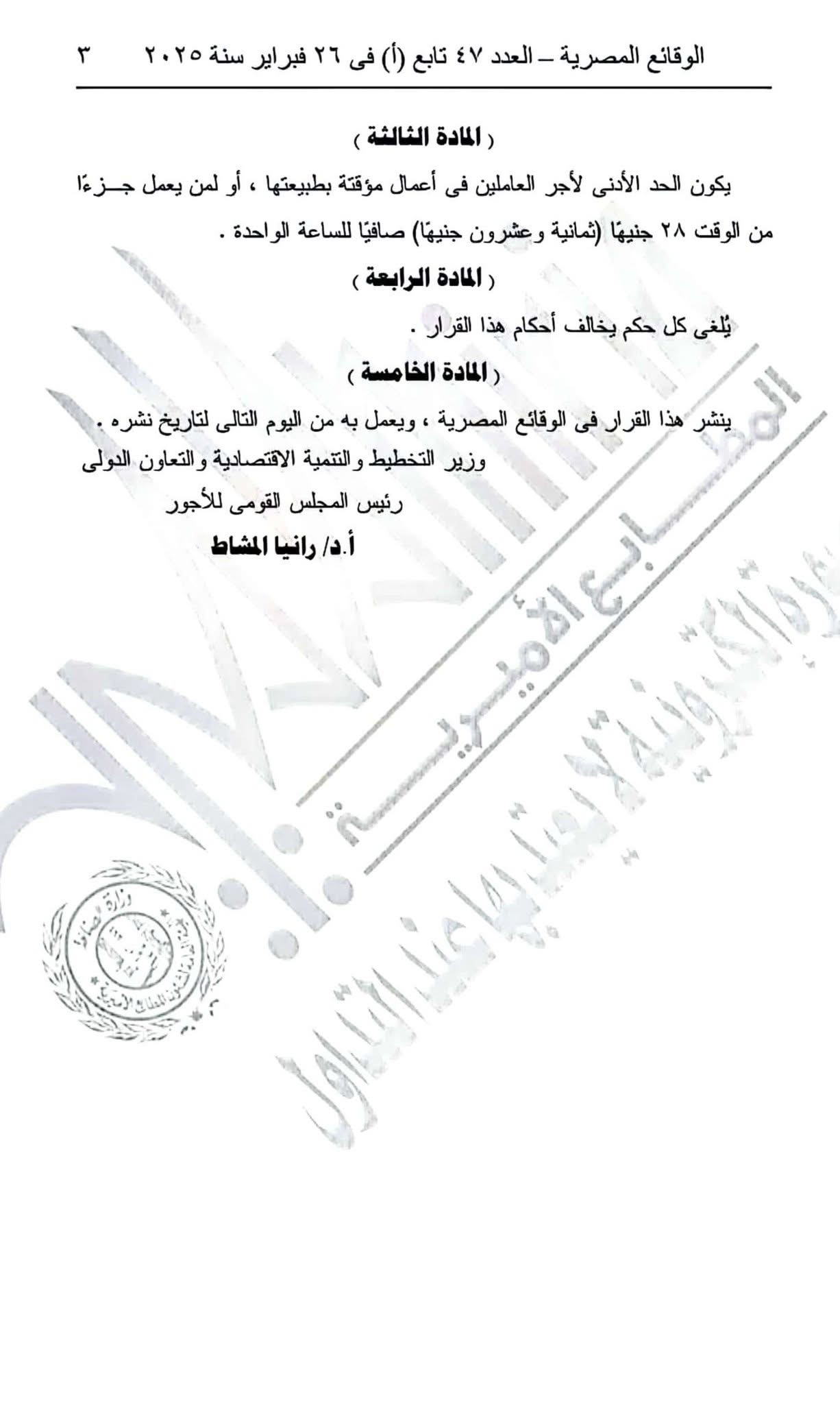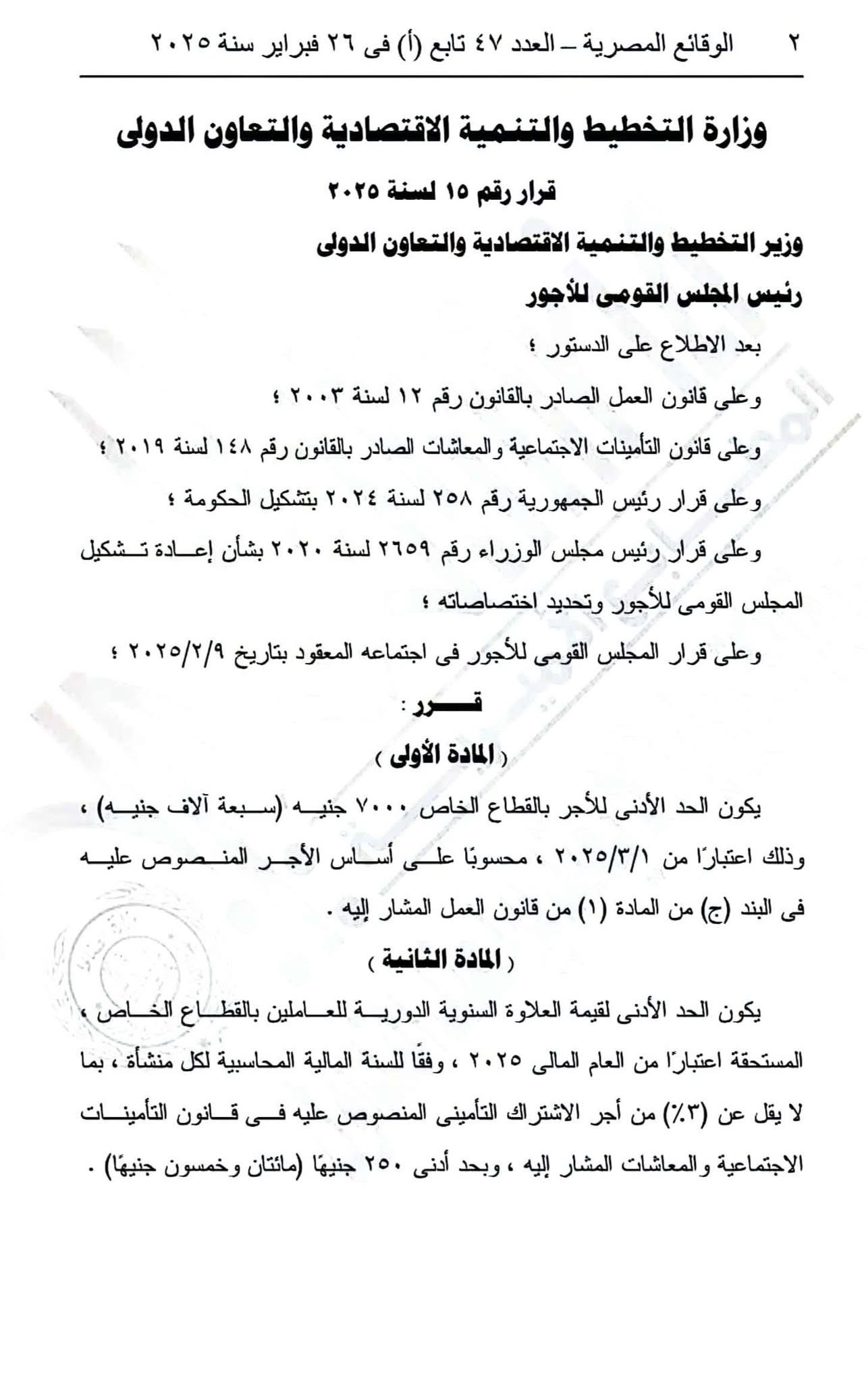 الحد الأدنى للأجر بالقطاع الخاص سبعة آلاف جنيه.. نشرت جريدة الوقائع المصرية، اليوم الأربعاء 26 فبراير 2025، قرار وزارة التخطيط والتنمية الإقتصادية والتعاون الدولي، قرار رقم (15) لسنة 2025، برفع الحد الأدنى للأجور بالقطاع الخاص من 6000 إلى 7000 جنيه، وذلك إعتباراً من 1 مارس 2025