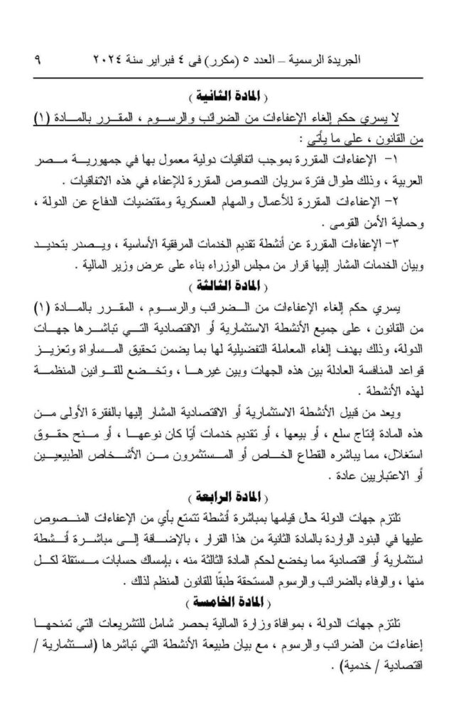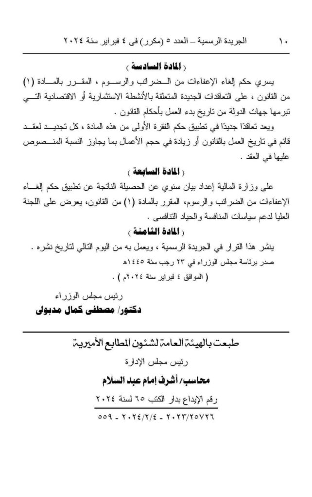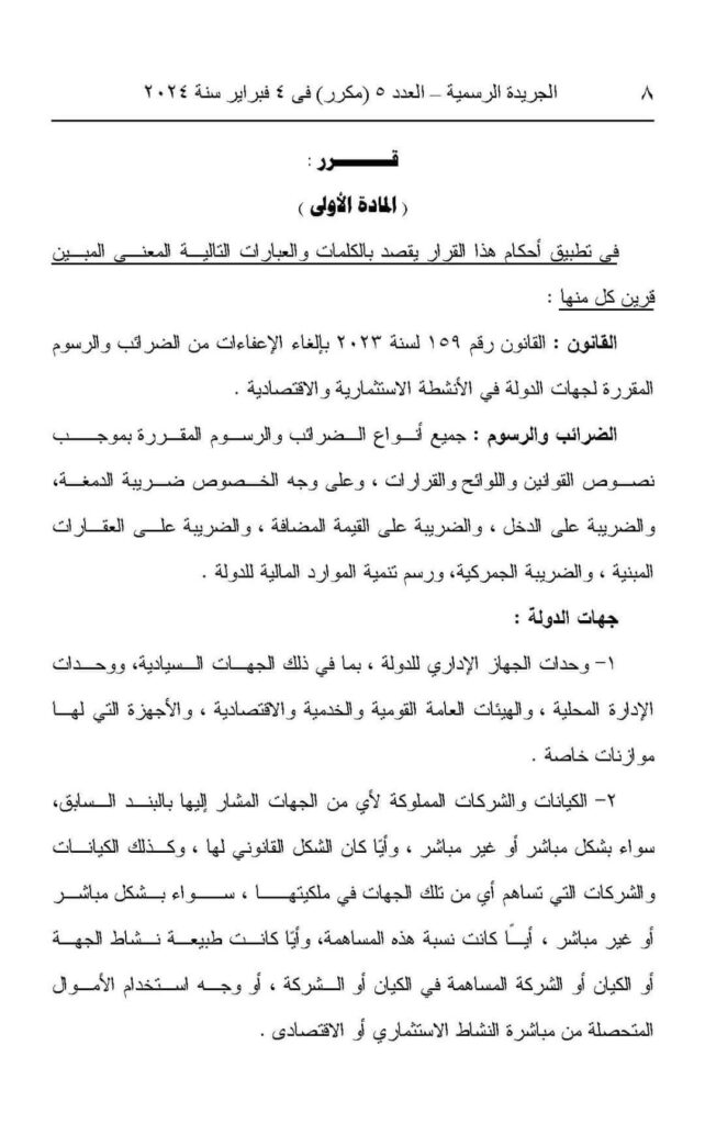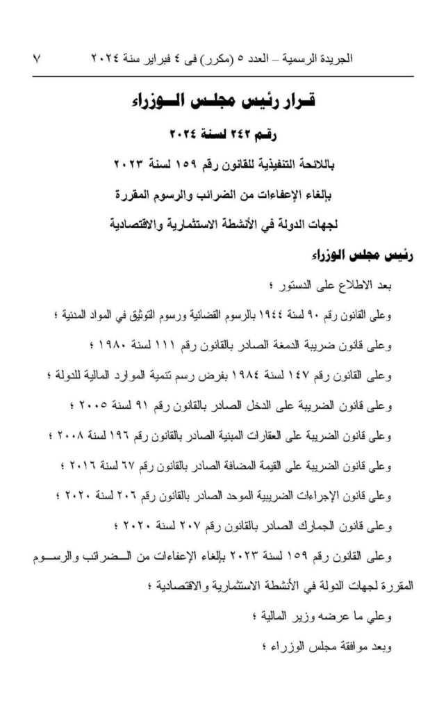 اللائحة التنفيذية لقانون إلغاء الإعفاءات الضريبية والرسوم لجهات الدولة.. نشرت الجريدة الرسمية، اليوم الإثنين، قرار الدكتور مصطفى مدبولى رئيس مجلس الوزراء رقم (242) لسنة 2024، بشأن إلغاء الإعفاءات من الضرائب والرسوم المقررة لجهات الدولة فى الأنشطة الإستثمارية والإقتصادية.