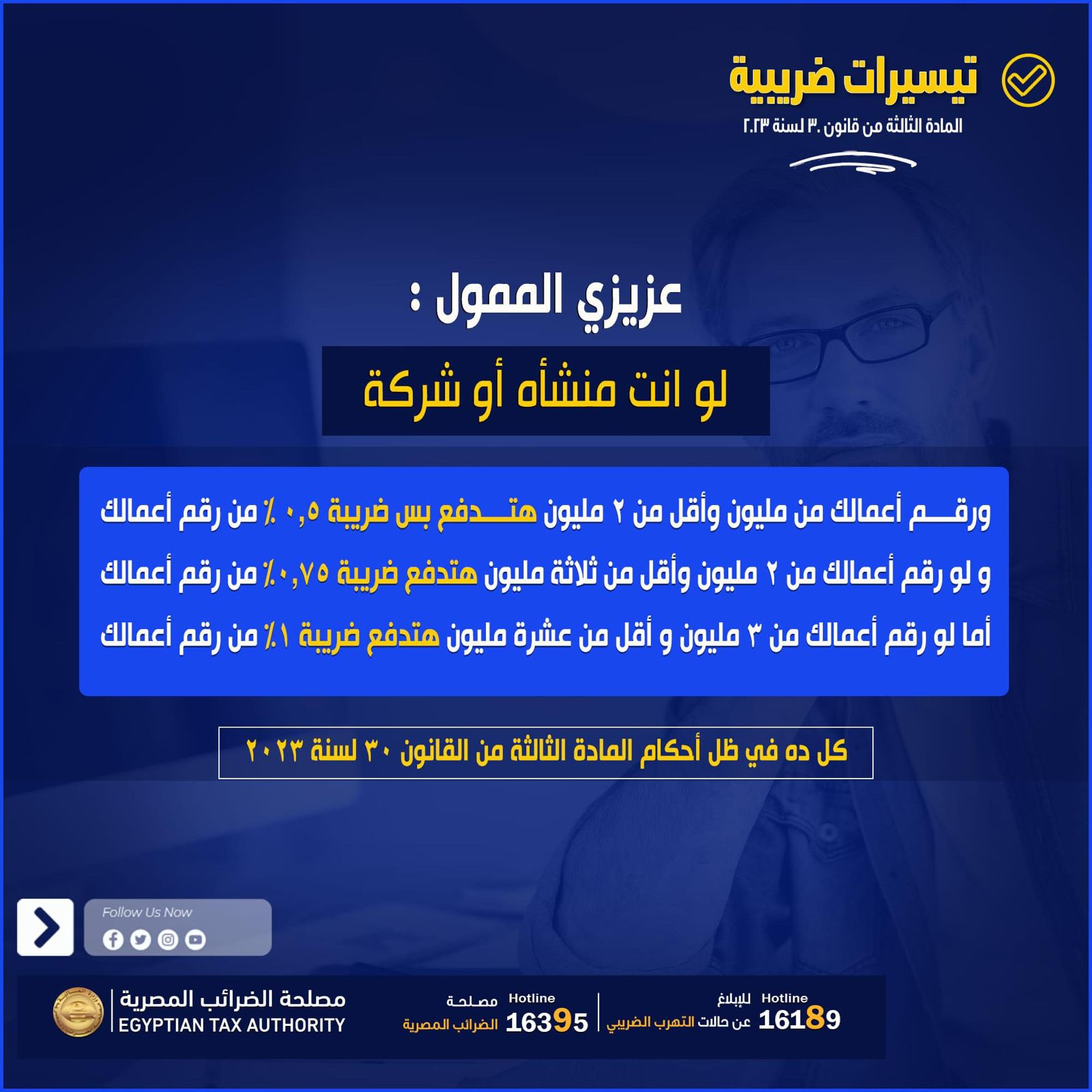 لو انت منشأه أو شركة ورقم أعمالك من مليون وأقل من 2 مليون هتدفع بس ضريبة 5. % من رقم أعمالك .