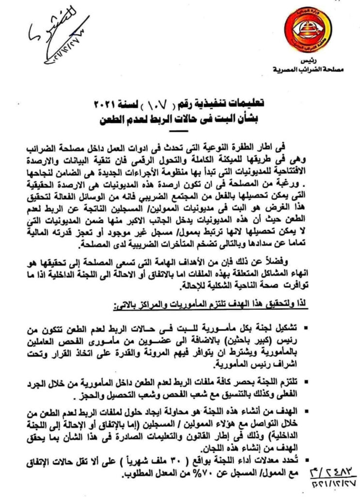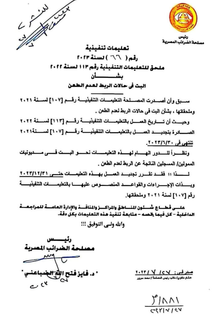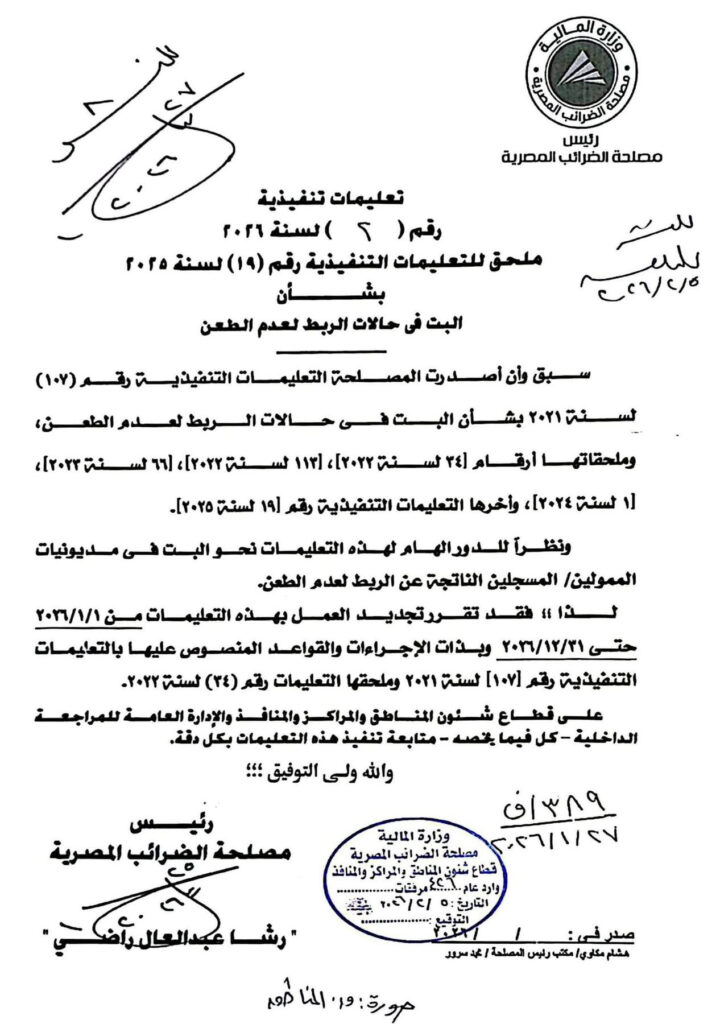 تجديد تعليمات حالات الربط لعدم الطعن حتى نهاية العام الحالي.. تعليمات تنفيذية رقم (2) لسنة 2026، ملحق للتعليمات التنفيذية رقم (19) لسنة 2025، صادرة عن مصلحة الضرائب المصرية، بشأن البت فى حالات الربط لعدم الطعن، وتجديد العمل بهذه التعليمات من 2026/1/1 حتى 2026/12/31.