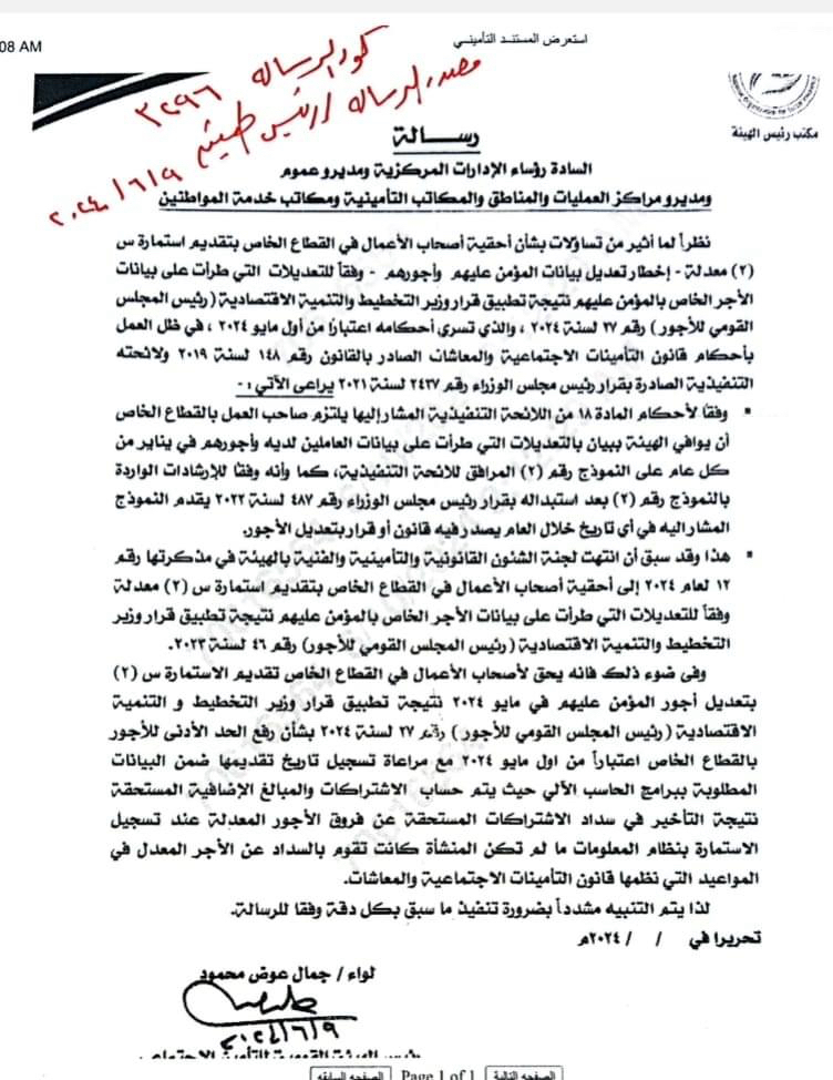 تعليمات الهيئة العامة للتامينات باستلام س2 المعدلة بعد قرار الحد الادنى 6000 جنية
