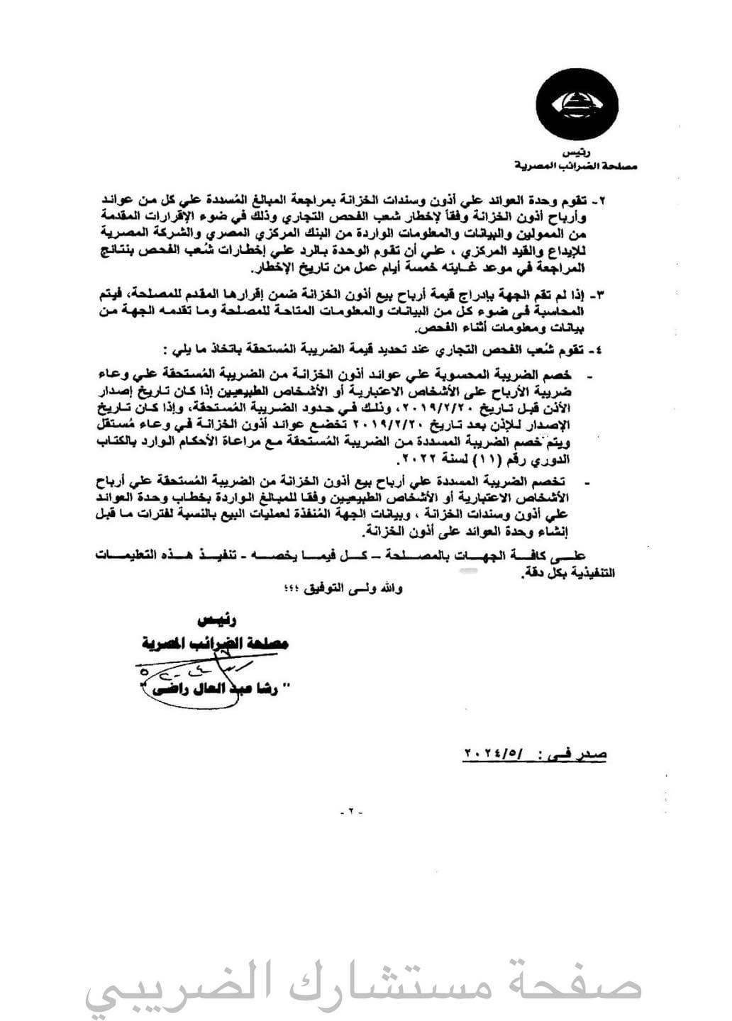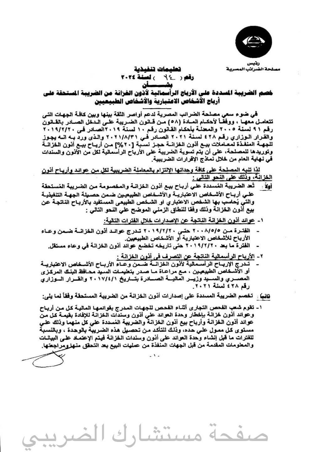 بشأن خصم الضريبة المسددة على الارباح الرأسمالية لأذون الخزانة من الضريبة المستحقة على أرباح الأشخص الاعتبارية والأشخاص الطبيعيين .