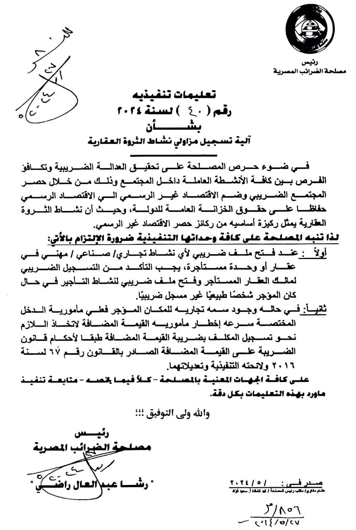 تعليمات تنفيذية رقم (40) لسنة 2024، صادرة عن مصلحة #الضرائب المصرية، بشأن آلية تسجيل مزاولي نشاط الثروة العقارية.