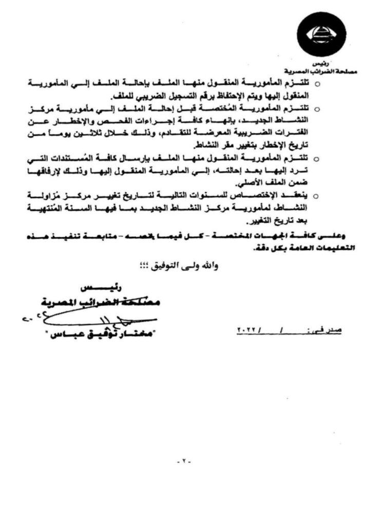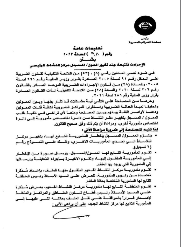 تعليمات رقم ٩٨ لسنة ٢٠٢٢ الإجراءات المتبعة عند تغيير الممول / المسجل مركز النشاط الرئيسي