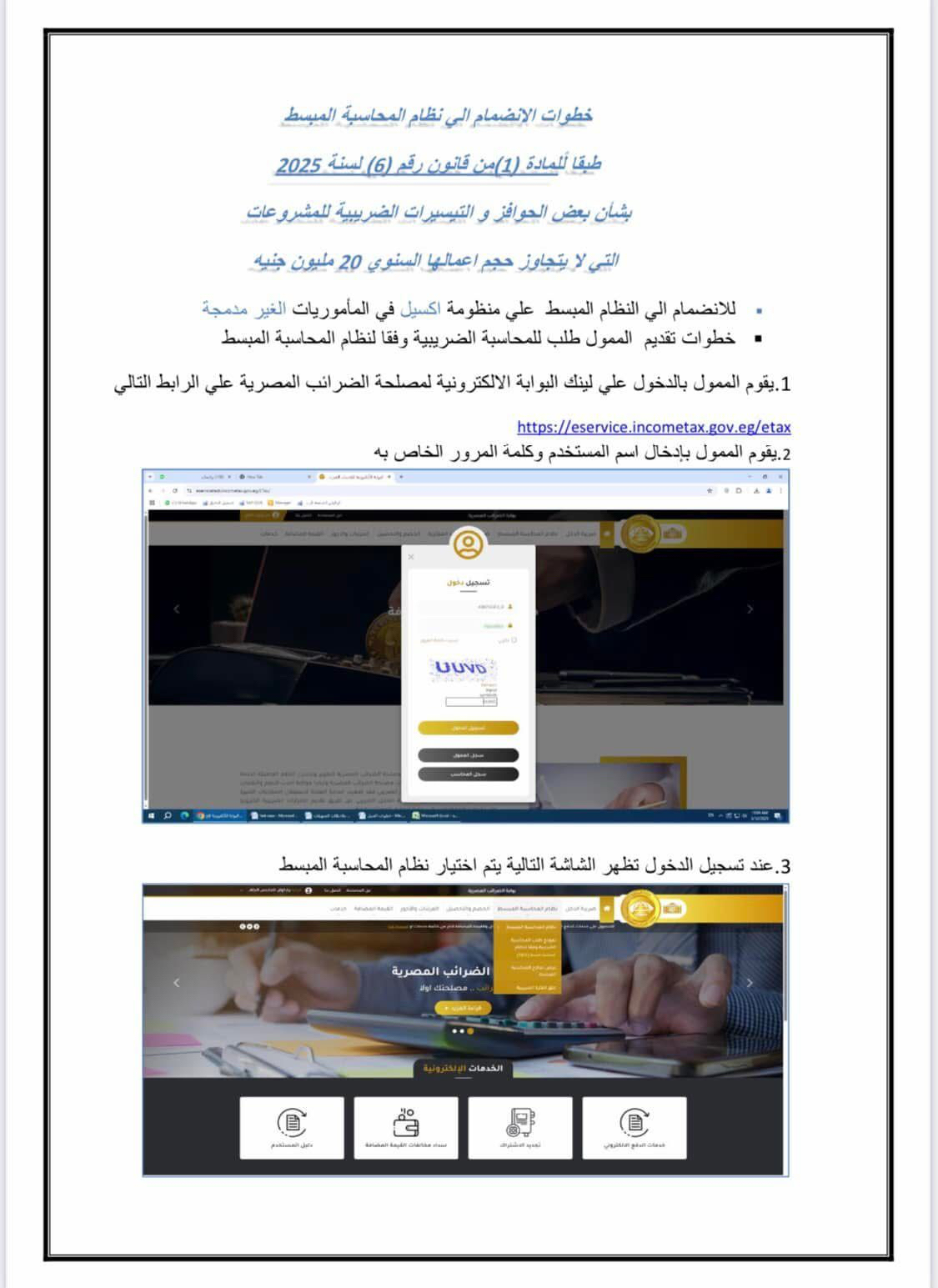 1- خطوات تقديم طلب المحاسبة المبسط بمنظومة اكسيل ( الماموريات غير المدمجة) طبقا للمادة (1) من قانون رقم (6) لعام 2025 بشأن بعض الحوافز و التيسيرات الضريبية للمشروعات التي لا يتجاوز حجم اعمالها السنوي 20 مليون جنيه