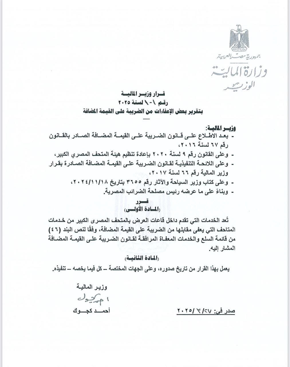 ‎رقم ١٠١ لسنة ٢٠٢٥ بشأن اعفاء الخدمات التي تقام داخل قاعات العرض بالمتحف المصرى من الضريبة على القيمة المضافة