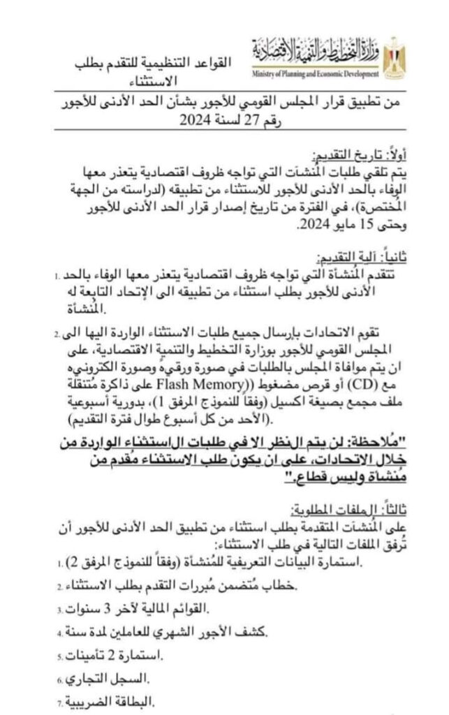 شروط الإستثناء من الحد الادنى للاجور ال٦٠٠٠ج المستندات المطلوبه لتقديم إستثناء من تطبيق الحد الادنى للاجور ال٦٠٠٠ج:- منها الميزانية اخر ثلاث سنوات وكشف مرتبات مدة سنة المستندات المطلوبة👇