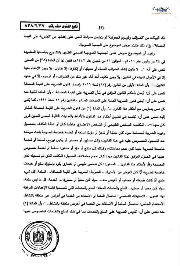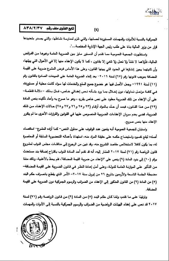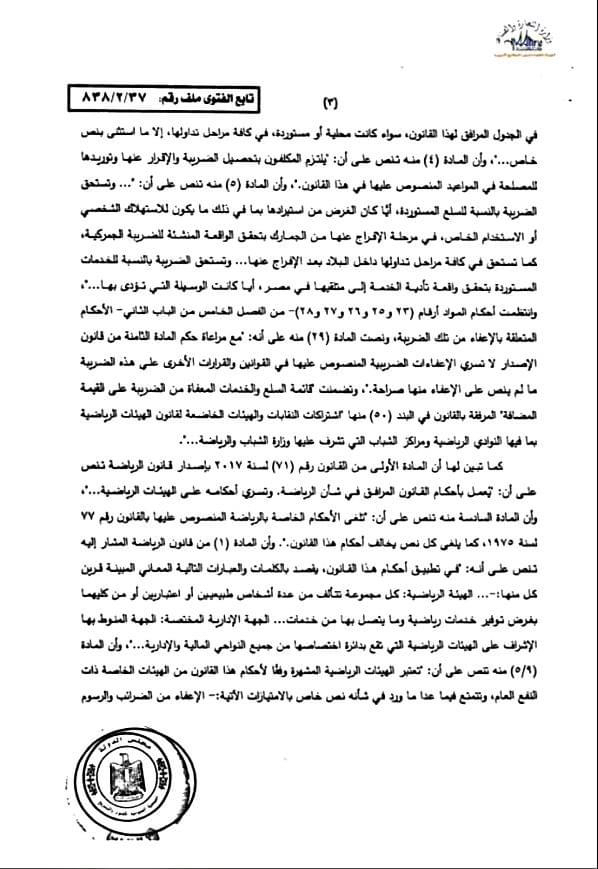 فتوى قضائية تؤكد: إعفاء الهيئات الرياضية من ضريبة القيمة المضافة مقصور على الإشتراكات فقط وعدم قانونية إعفاء مشترياتهم