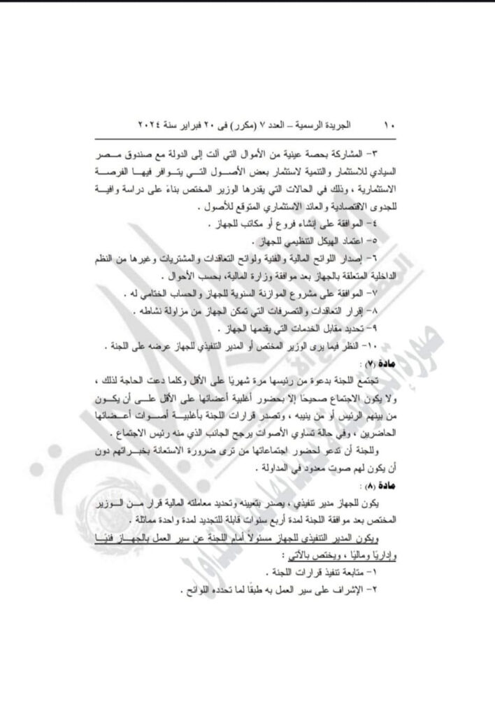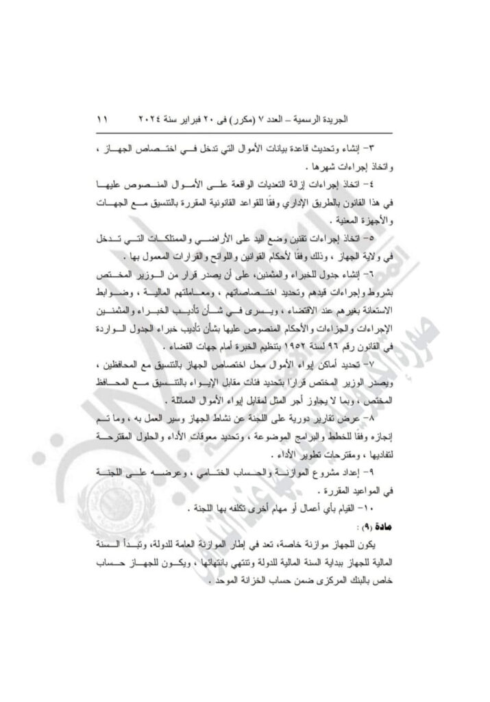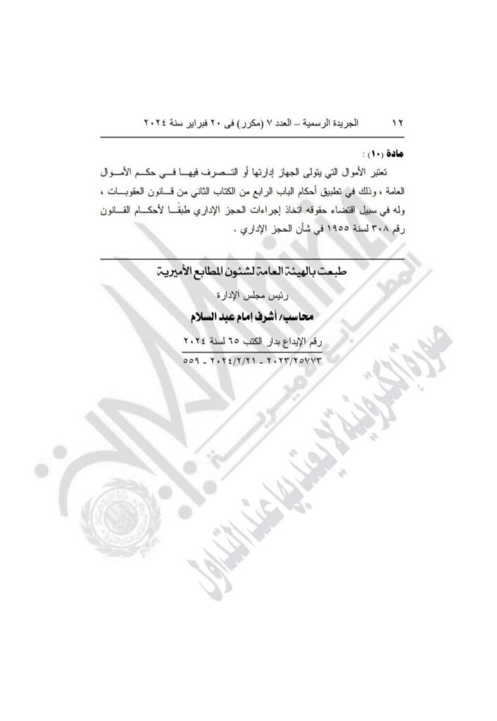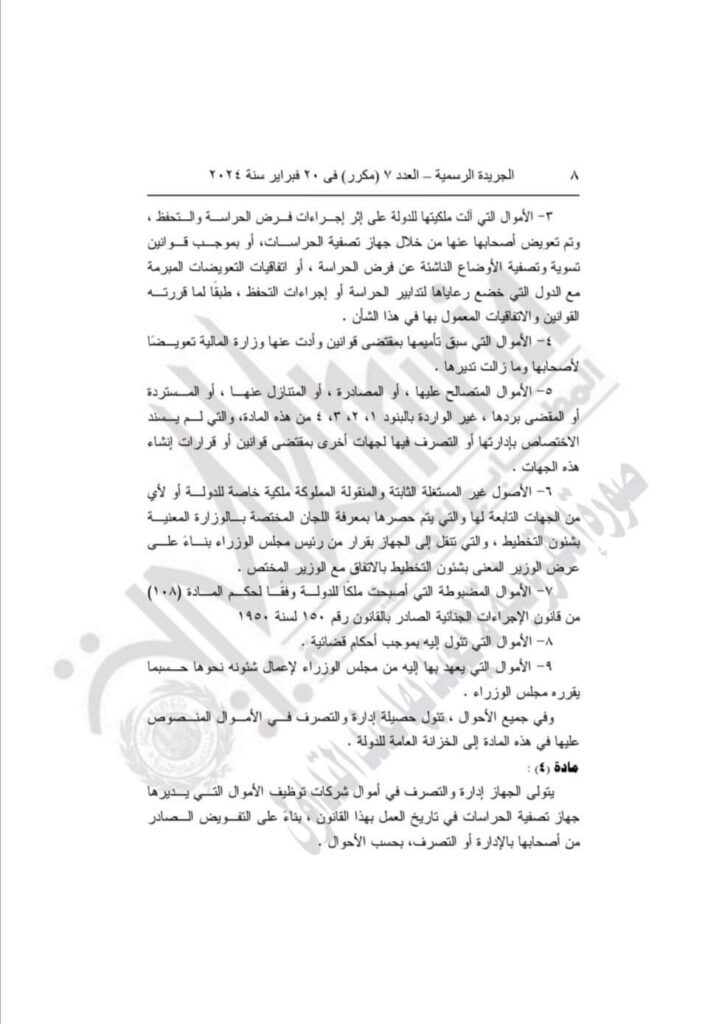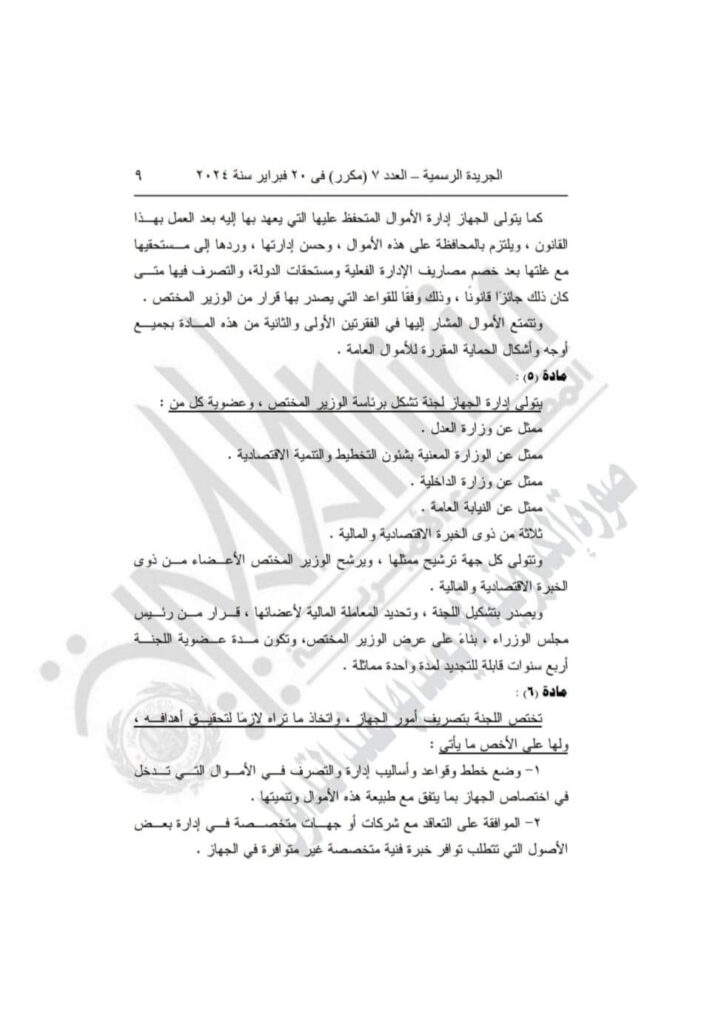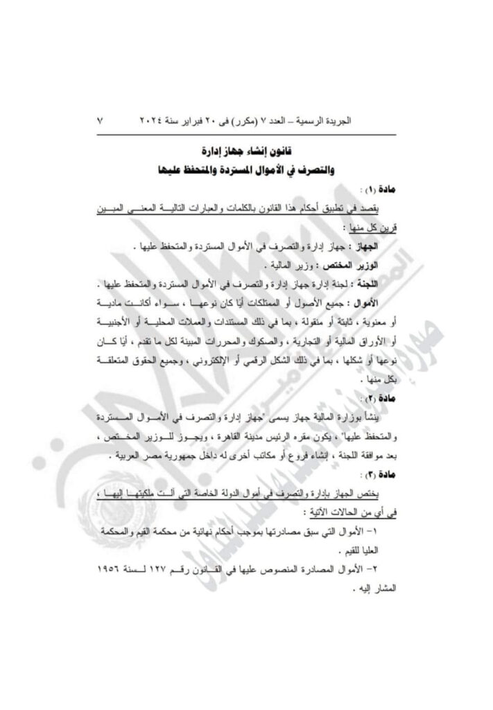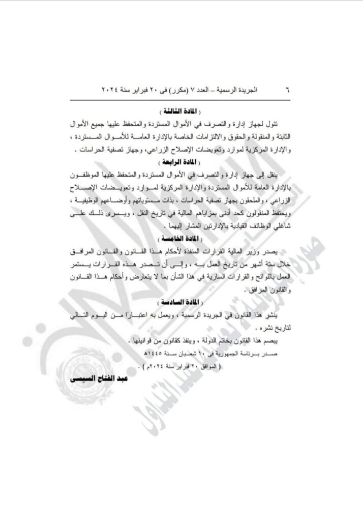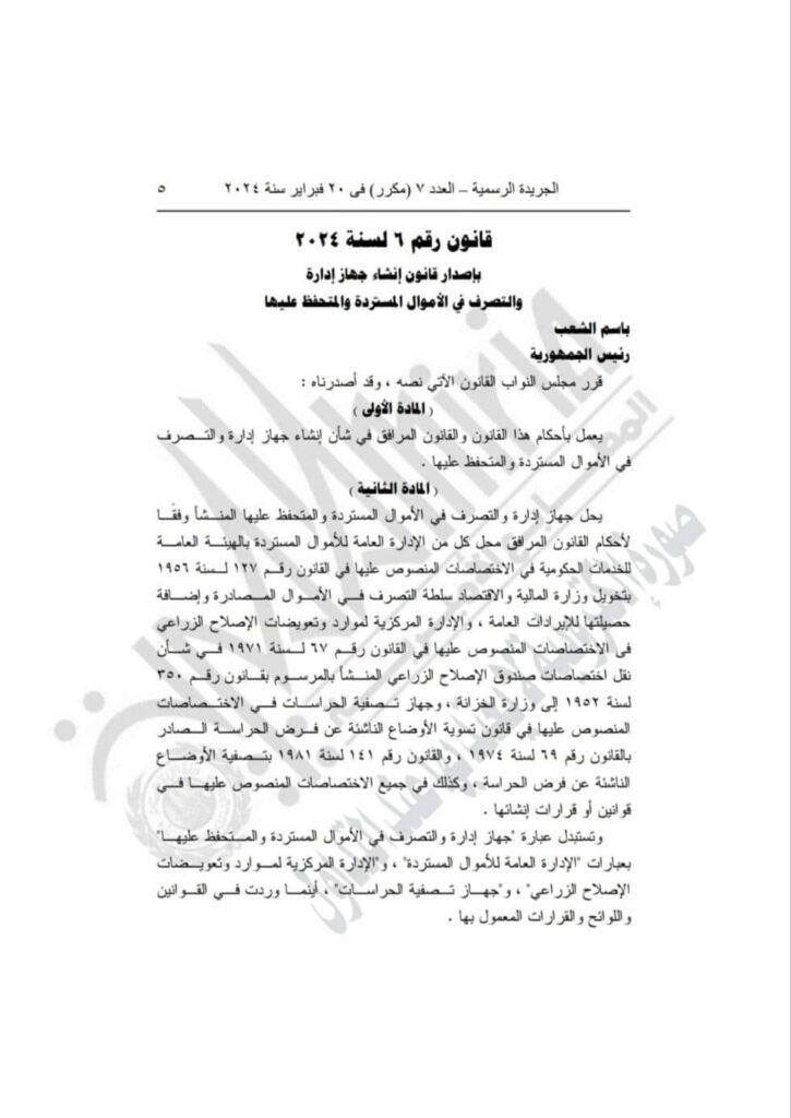 قانون رقم (٦) لسنة ٢٠٢٤ بإصدار قانون إنشاء جهاز إدارة والتصرف فى الأموال المستردة والمتحفظ عليها