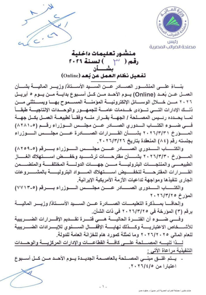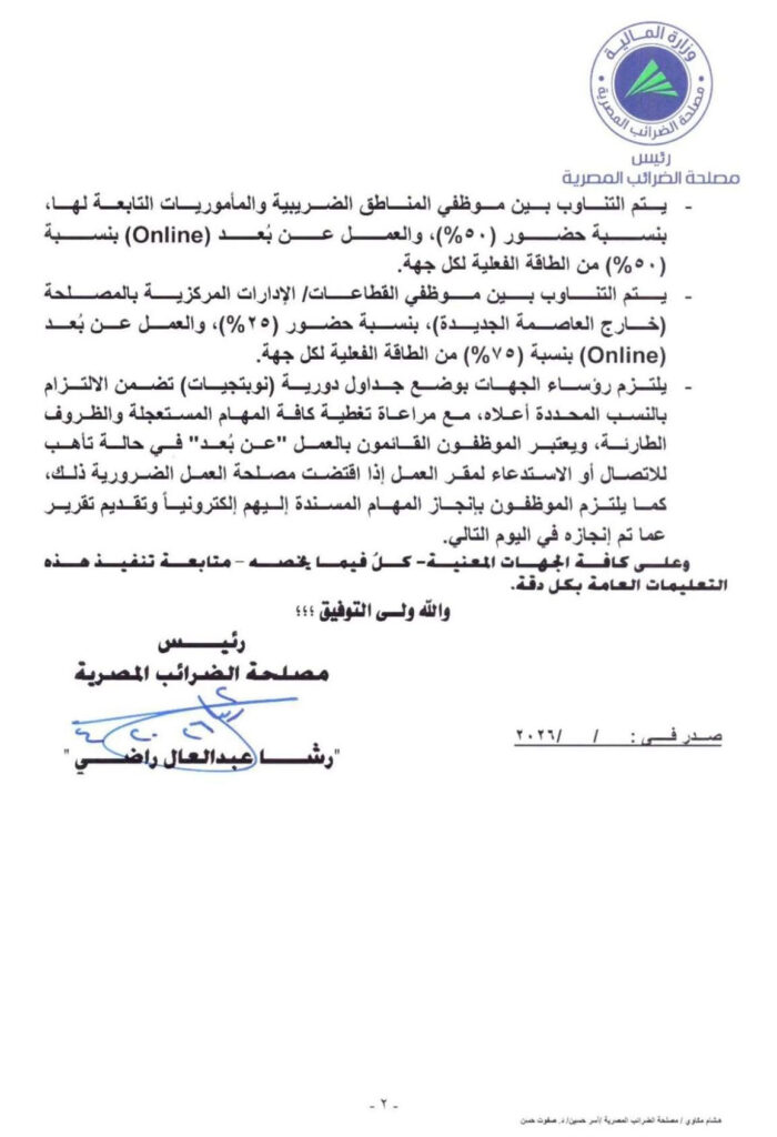 قرار مصلحة الضرائب المصرية حول تفعيل نظام العمل عن بعد في كافة المأموريات بداية من يوم الأحد القادم.