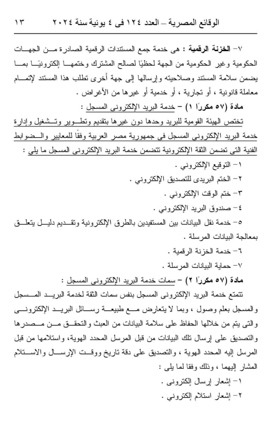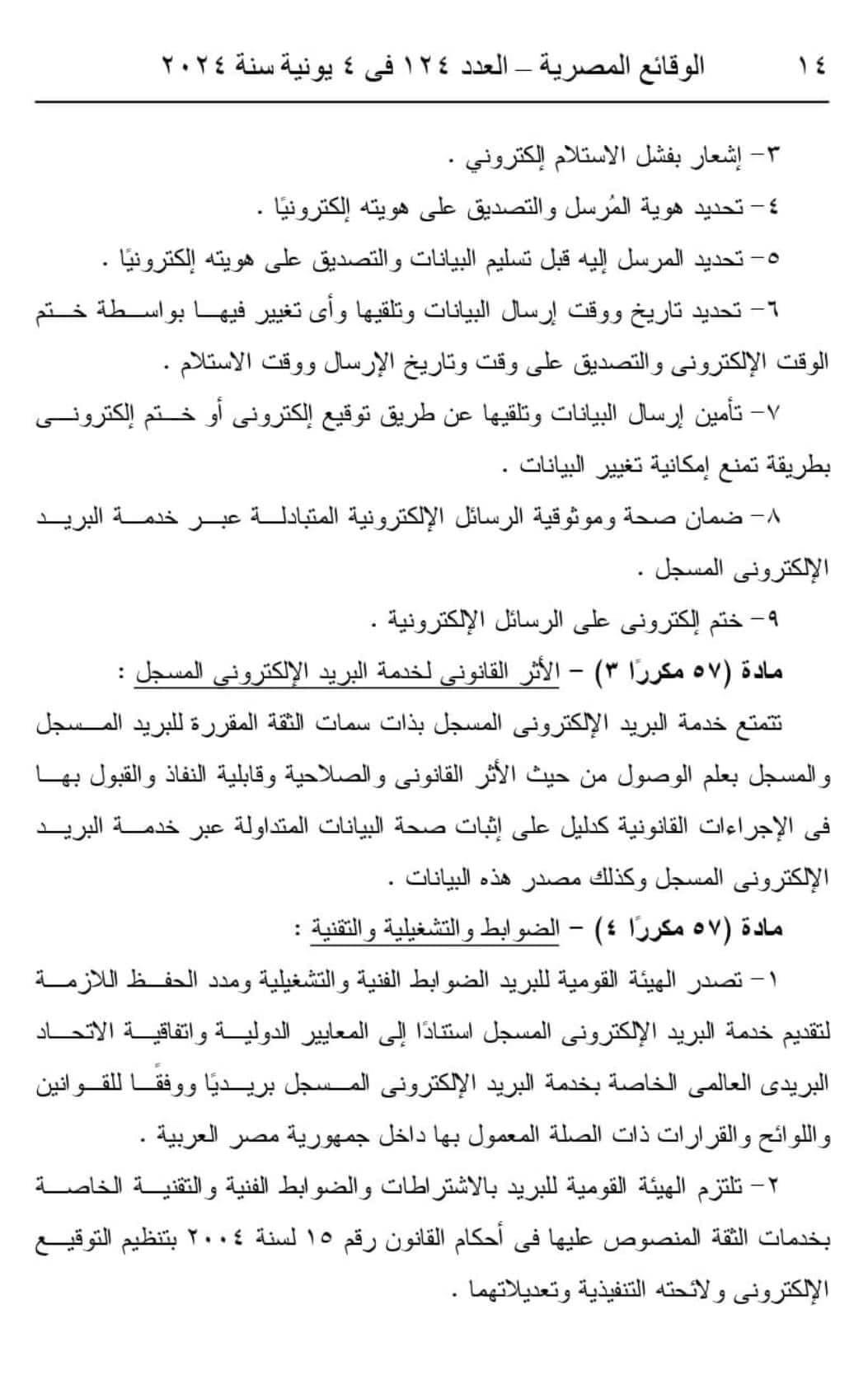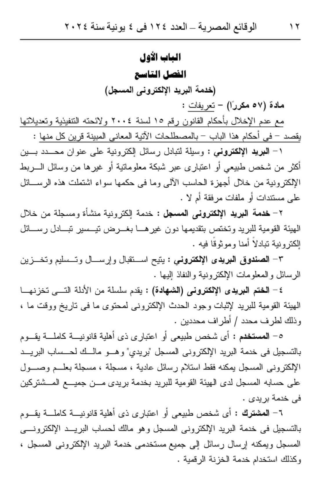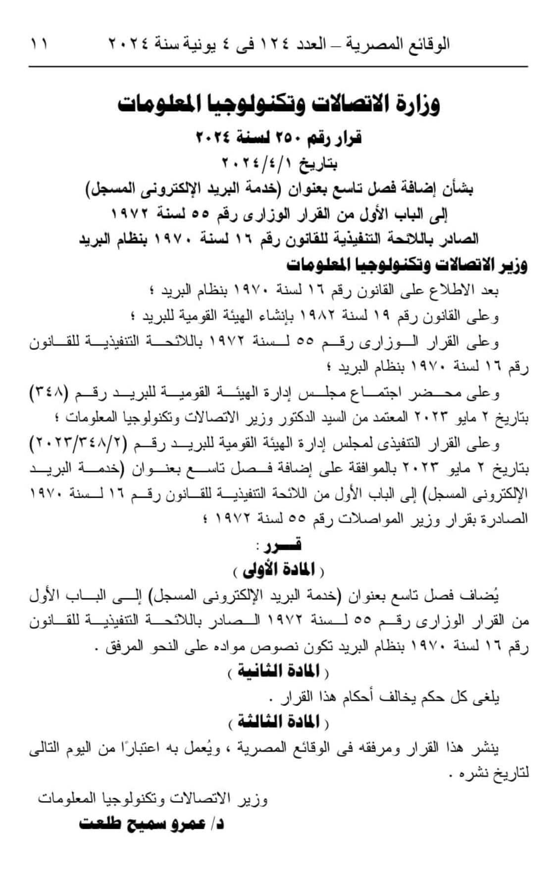 قرار وزير الاتصالات وتكنولوجيا المعلومات رقم 250 لعام 2024 بشأن : إضافة فصل تاسع بعنوان (خدمة البريد الإلكترونى المسجل) إلى الباب الأول من القرار الوزارى رقم 55 لعام 1972 الصادر باللائحة التنفيذية للقانون رقم 16 لعام 1970 بنظام البريد.