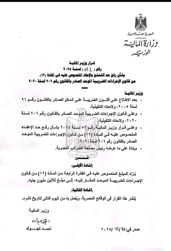 قرار وزير المالية برفع حد الإعفاء من تقديم