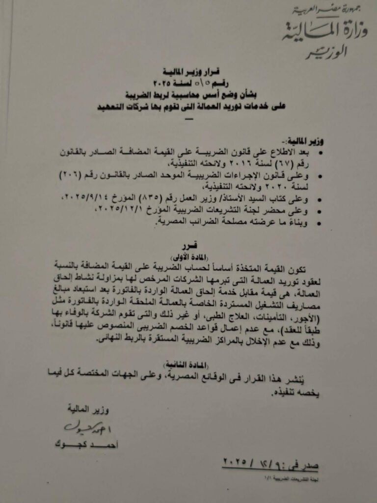 ولتوضيح اختلاف المعاملة الضريبية فيما يخص ضريبة القيمة المضافة عن خدمات توريد العمالة وذلك فى ضوء إصدار قرار وزير المالية رقم 515 لسنة 2025 بتاريخ اليوم 9 ديسمبر 2025 :-