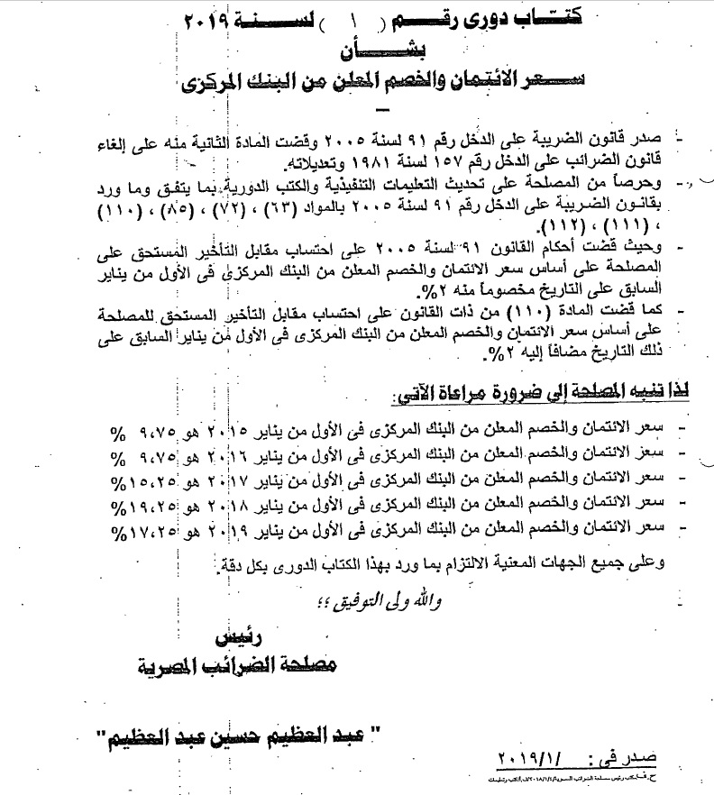 كتاب دورى رقم 1 لعام 2019 بخصوص سعر الائتمان و الخصم