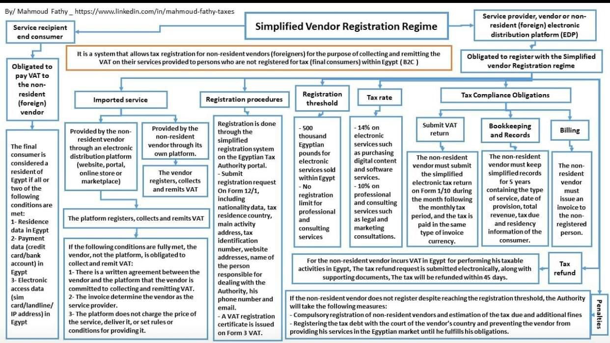 Through this system, the non-resident vendor can submit the monthly VAT return and remit the tax due on services provided inside Egypt